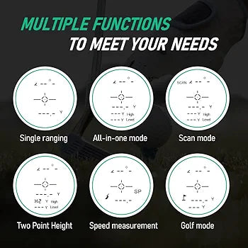 Line of sight distance, vertical distance, horizontal distance, angle, speed, scan, height difference of 2 points, golf slope distance