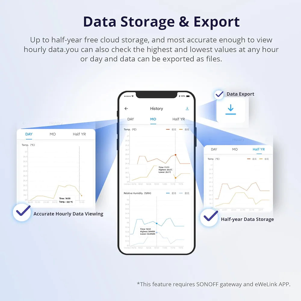 ✅【Data Storage & Export】Up to half-year free cloud storage, and most accurate enough to view hourly data. you can also check the highest and lowest values at any hour or day and data can be exported as files.
